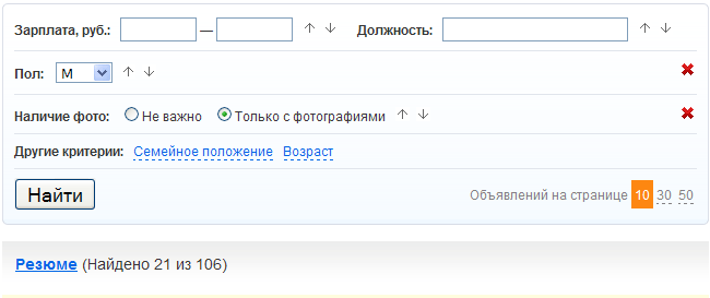 Чтобы посмотреть нужные объявления в списке, достаточно задать необходимые критерии фильтрации. Например, показать резюме женщин с фотографиями.
