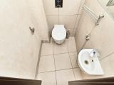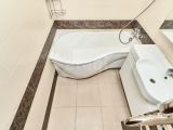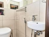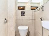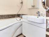 Раздельный санузел: ванная с плиткой, акцентным бордюром и удобной ванной; туалет со встроенным инсталляционным блоком, умывальником и гигиеническим душем.